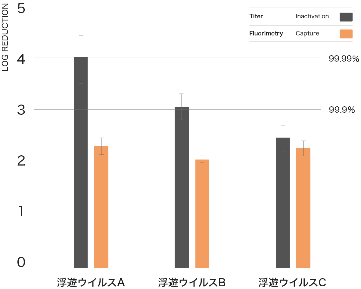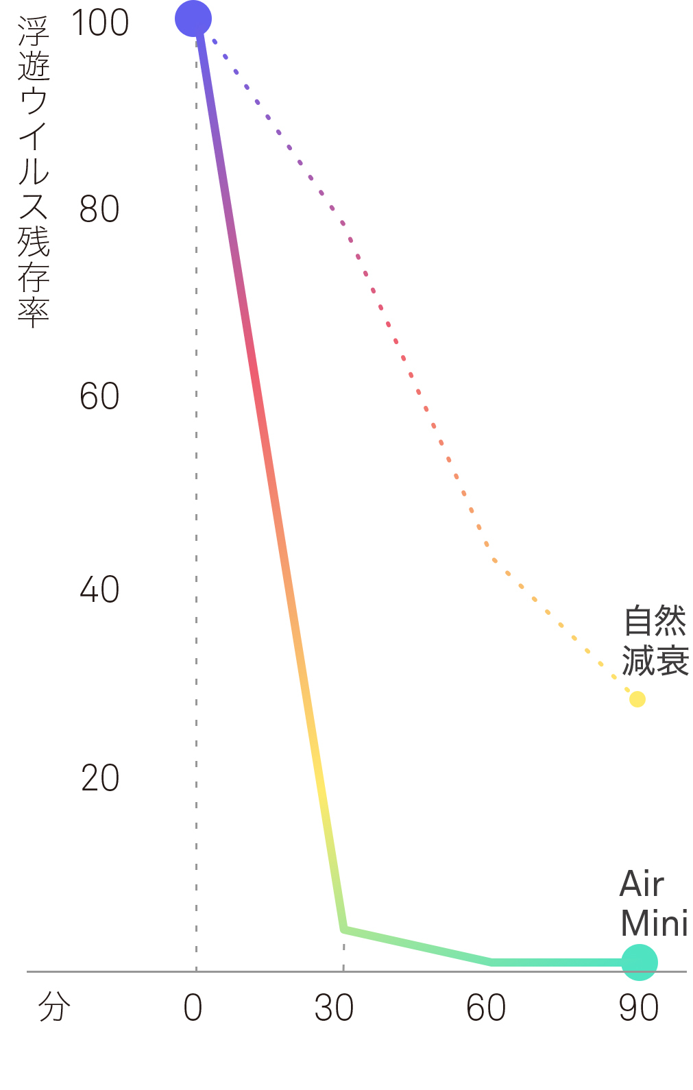 試験方法:試験空間内で、攪拌ファンを作動させながら、ウイルス液を10分間噴霧し、2分攪拌した後に、試験空間内の空気から初発(0分)の浮遊ウイルスを捕集した。その後、攪拌ファンを止め、Molekule Air Mini+を運転し、30、60、90分後に浮遊ウイルスを捕集した。なお、自然減衰(コントロール)も実施し、それぞれのサンプルの浮遊ウイルス数を測定した。