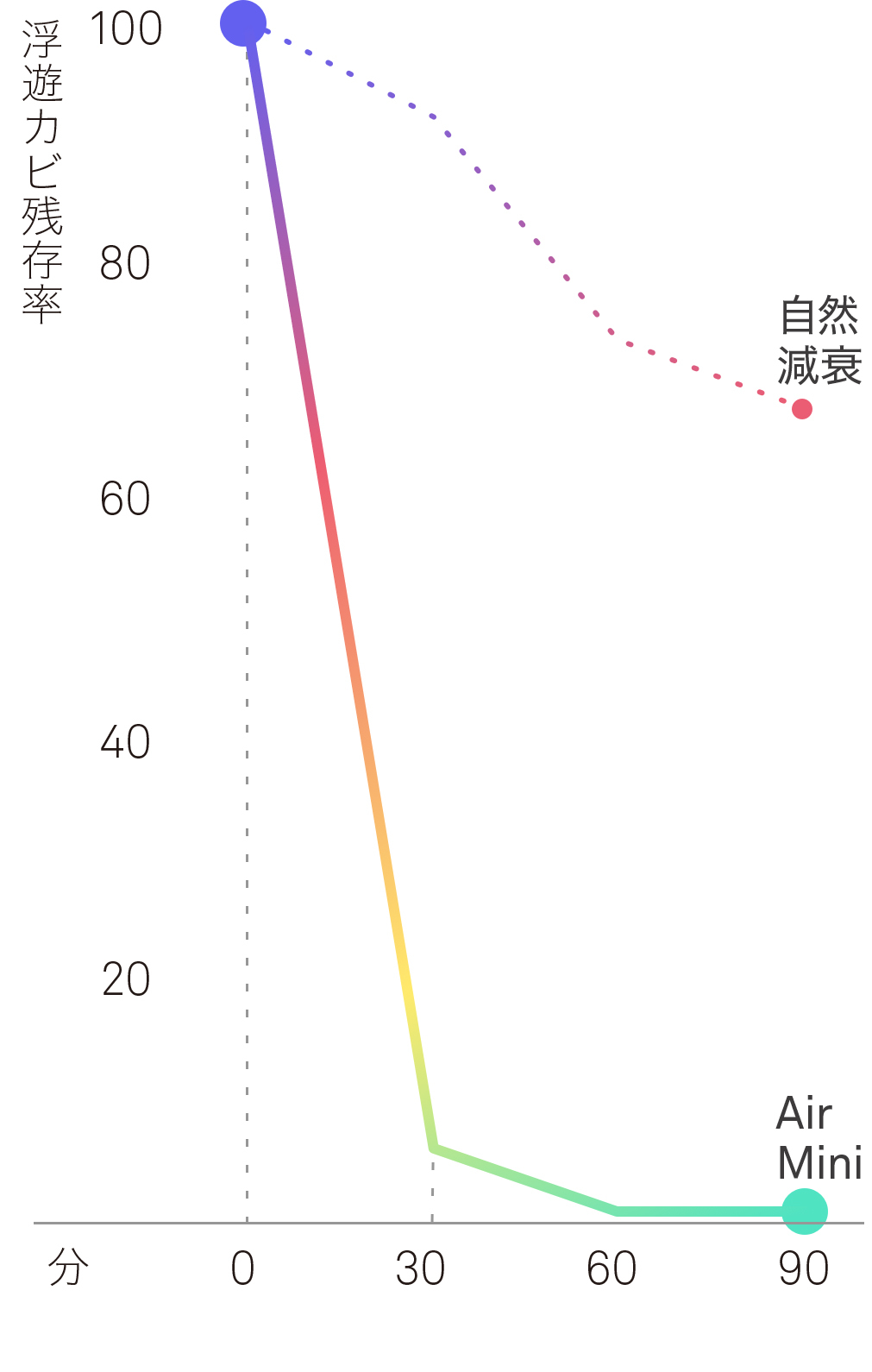 実験方法:試験空間内で、攪拌ファンを作動させながら、カビ胞子液を10分間噴霧し、2分攪拌した後に、試験空間内の空気から初発(0分)の浮遊カビを捕集した。その後、攪拌ファンを止め、Molekule Air Mini+を運転し、30、60、90分後に浮遊カビを捕集した。なお、自然減衰(コントロール)も実施し、それぞれのサンプルの浮遊カビ数を測定した。