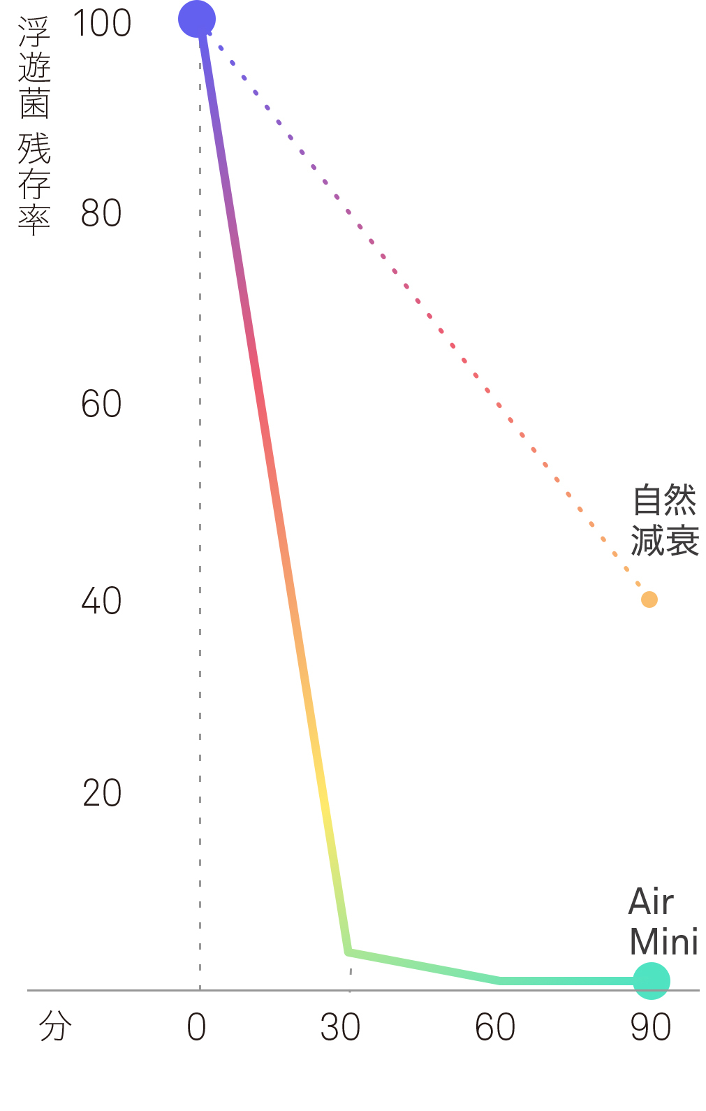実験方法:試験空間内で、攪拌ファンを作動させながら、菌液を10分間噴霧し、2分攪拌した後に、試験空間内の空気から初発(0分)の浮遊菌を捕集した。その後、攪拌ファンを止め、Molekule Air Mini+を運転し、30、60、90分後に浮遊菌を捕集した。なお、自然減衰(コントロール)も実施し、それぞれのサンプルの浮遊菌数を測定した。