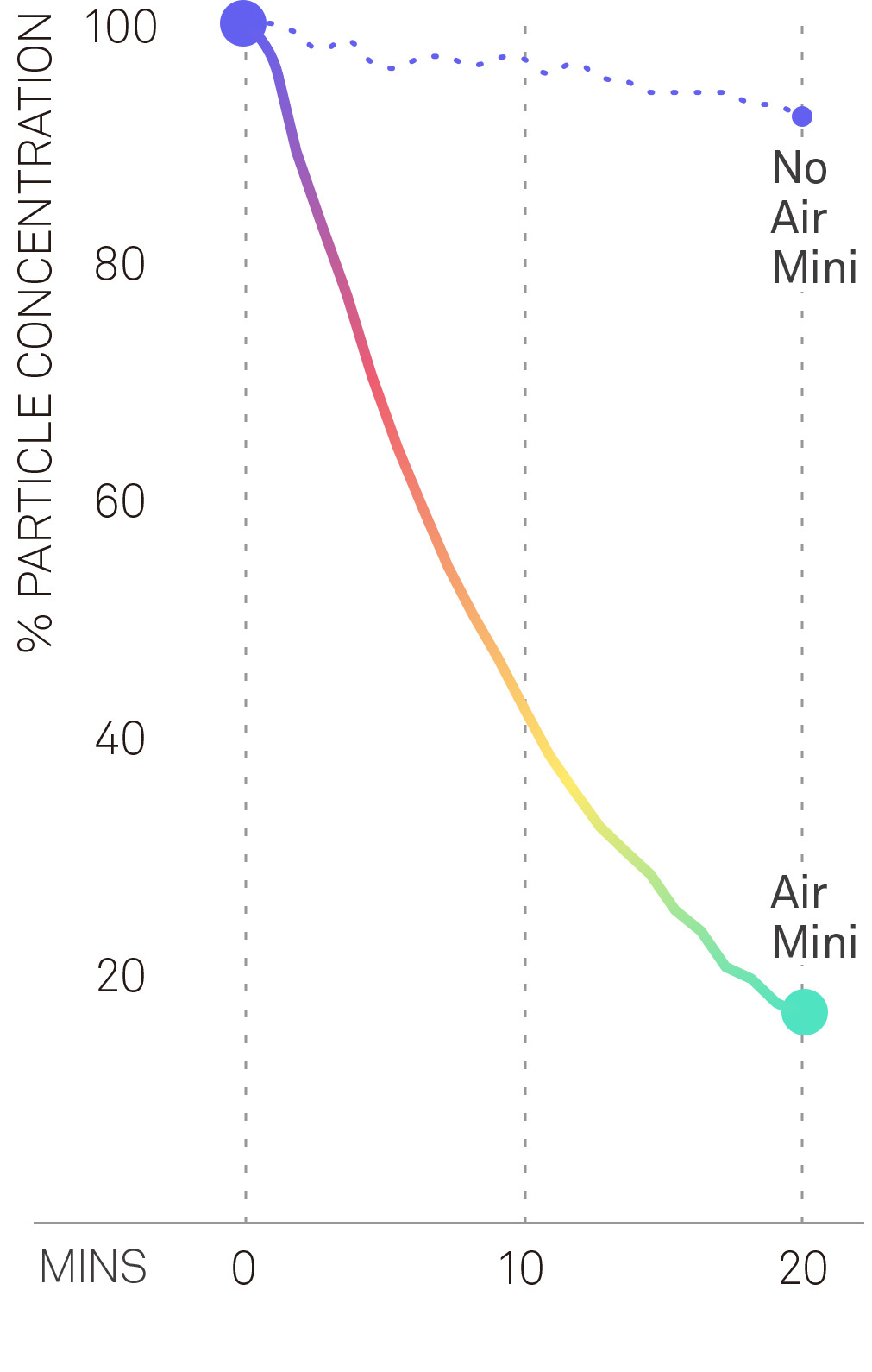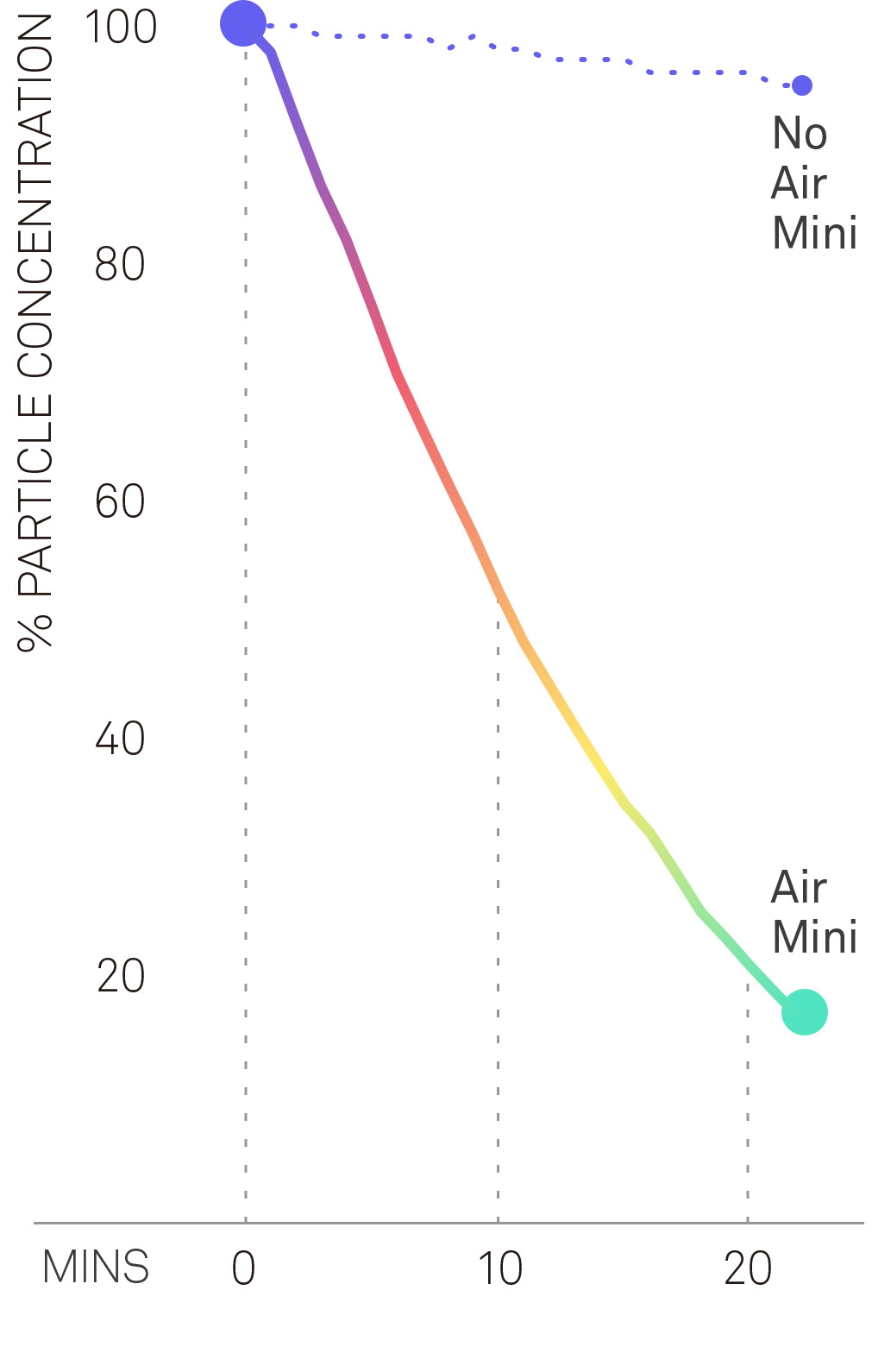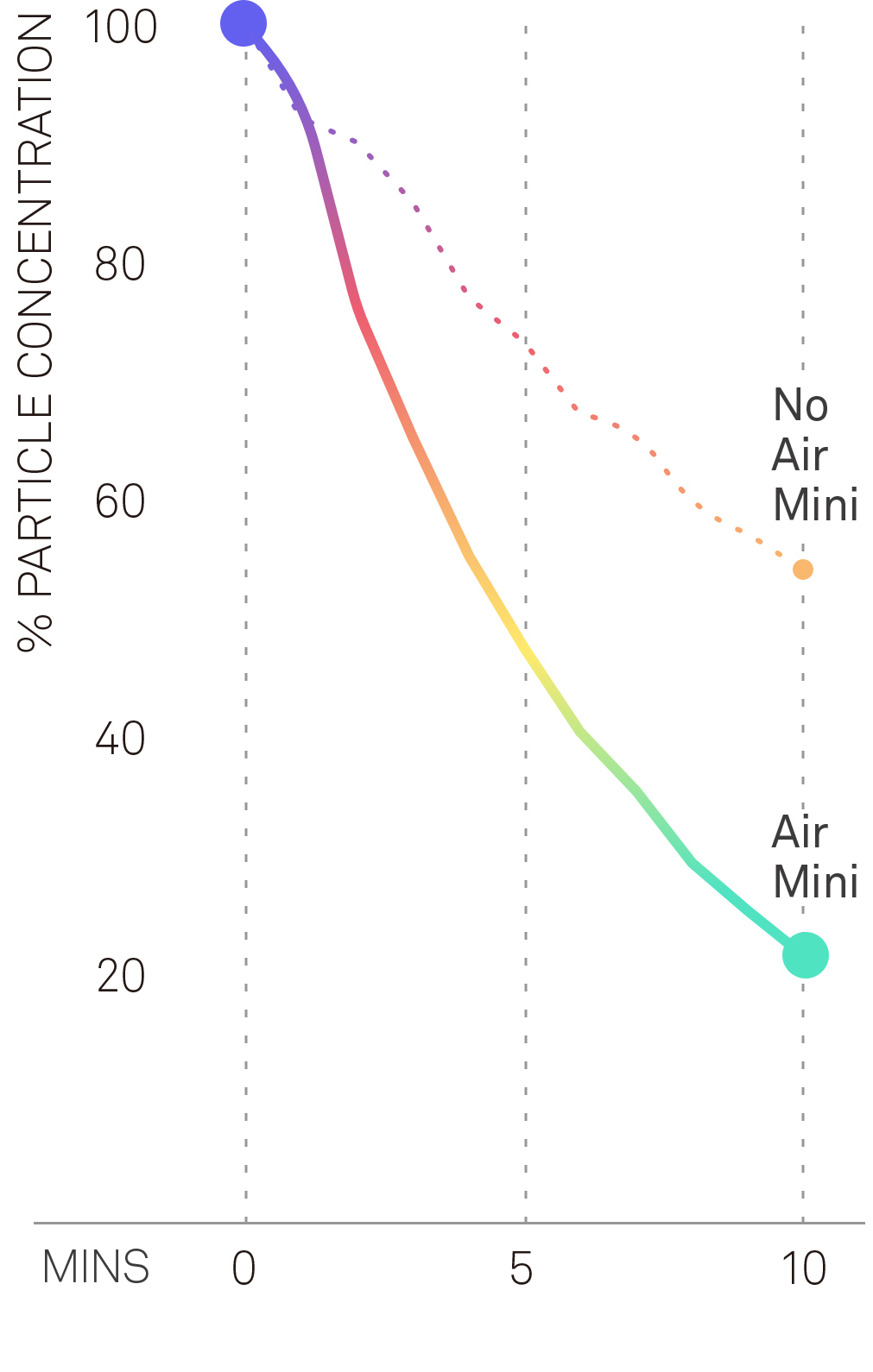 試験方法:ANSI(米国規格協会)/AHAM(米国家電製品協会)の規格に従った実験。実験空間に粒子を注入し、Molekule Airを稼働させ、レーザーエーロゾル分光計または空気力学的粒子径計を使用し、1分ごとに1立方メートル当たりの粒子濃度を測定。